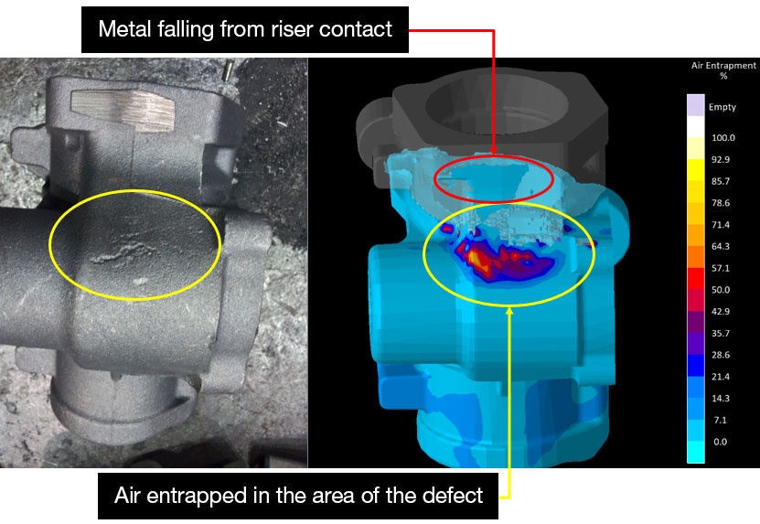 In addition to the cold metal and oxidized melt front that the runner to the top side riser was creating, it was also observed that the falling metal from the riser contact was entrapping air in the casting cavity in the same area where the defect was being observed as shown below.