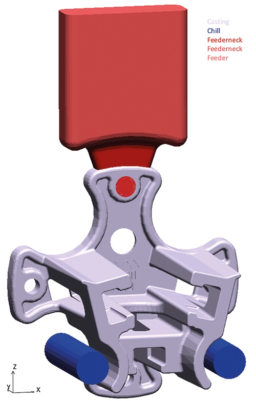 With this good basis, a virtual design of experiments (DoE) was set up in MAGMASOFT® to reduce both the shrinkage porosity (‘Porosity’) and the hot spots (‘Hot Spot’). The only parameters that could be modified were the feeder dimensions, additional machining allowances, and the use of copper inserts in the mold to influence the local cooling rate. Fig. 4 illustrates the selected geometry for the virtual experimental design.